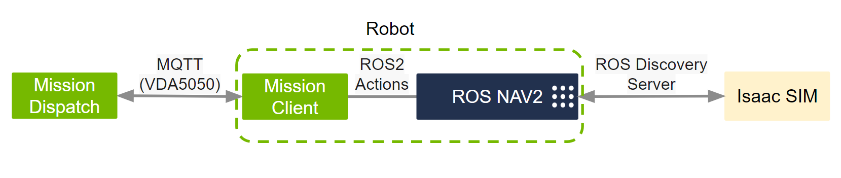 This tutorial walks you through steps to send missions from Mission Dispatch to Isaac ROS Mission Client using the VDA5050 protocol. The Mission Client is attached to an Isaac Sim environment running the Nav2 stack. The summary of steps are as follows: