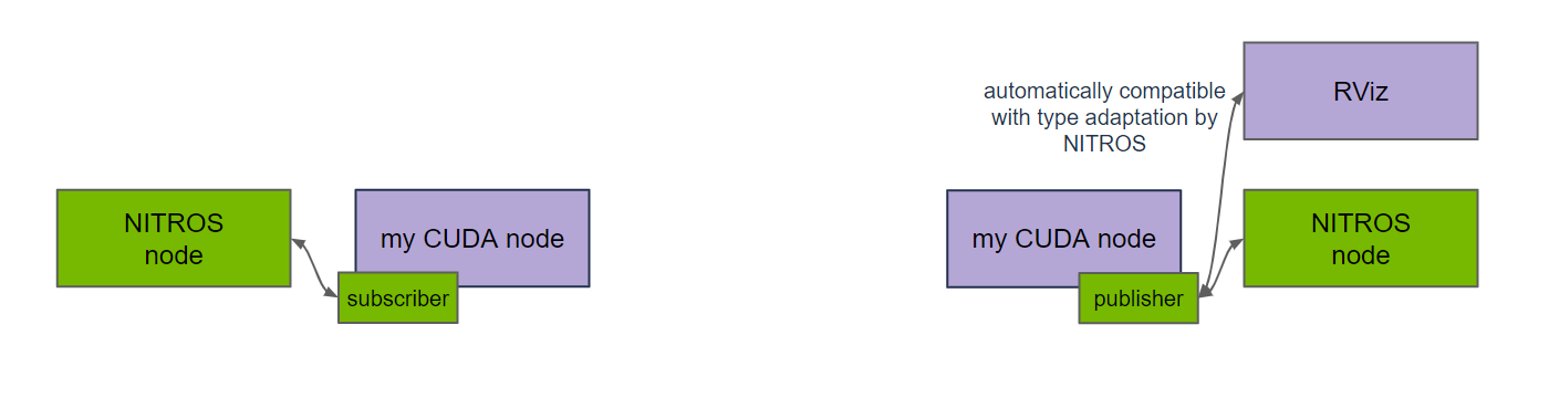 NITROS publisher and NITROS subscriber enable many design patterns compatible with Isaac ROS accelerate computing nodes, and traditional CPU nodes. For example publishing from a CUDA node directly to an Isaac ROS node, or visa-versa from an Isaac ROS node to a CUDA node. A CUDA node can be inserted between two Isaac ROS nodes, or even use multiple CUDA nodes in succession, all with the benefit of CUDA accelerated computing in each node. This creates more modular software designs, as CUDA accelerated functions can be packaged in individual nodes, instead of packing them together into a larger single node.